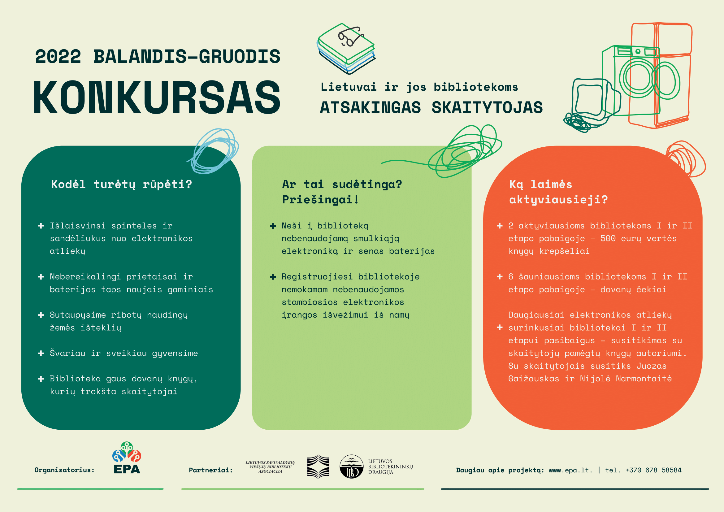 Šiaulių rajono savivaldybės viešoji biblioteka kartu su padaliniais jau keleri metai dalyvauja Elektronikos platintojų asociacijos (EPA) skelbiamame aplinkosaugos projekte „Atsakingas skaitytojas“. Pasiekti gerų atliekų surinkimo rezultatų, užimti prizinę vietą jau tapo beveik tradicija. Todėl ir šiemet biblioteka kviečia Šiaulių rajono gyventojus padėti mums ir toliau sėkmingai išlaikyti lyderių poziciją šiame projekte ir atsakingai atsikratyti namuose susikaupusiomis elektronikos atliekomis.
