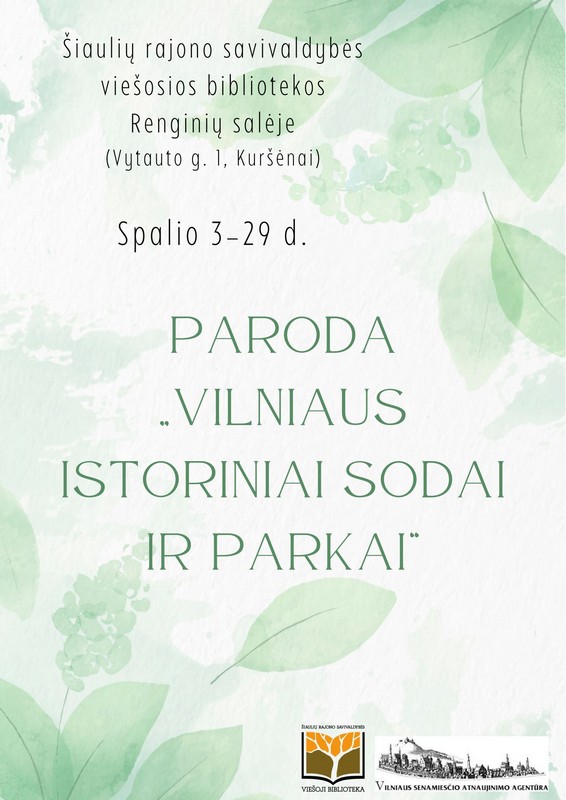 Šiaulių rajono savivaldybės viešosios bibliotekos renginių salėje (Vytauto g. 1, Kuršėnai) eksponuojama paroda „Vilniaus istoriniai parkai ir sodai”.