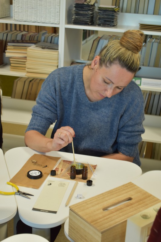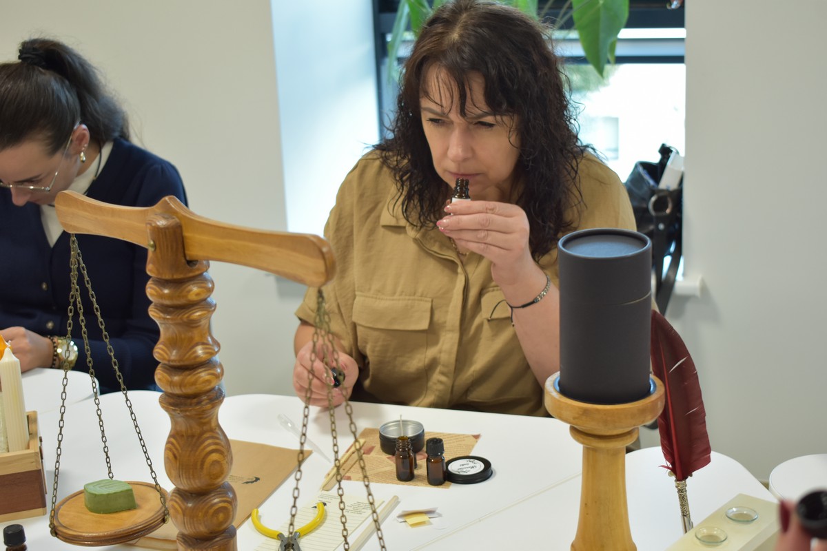 Kiekviena edukacijos dalyvė iš plataus eterinių aliejų pasirinkimo susikūrė savo individualų, unikalų kvapą, kuris džiugins tiek sielą, tiek ir kūną. Apjungus natūralų sojų pupelių vašką bei eterinių ir augalinių aliejų mišinį, dalyvės liejosi savo žvakes. Kol žvakės stingo, lektoriai supažindino su jų naudojamu sojų vašku, drauge tyrinėjome jo konsistenciją, bandėme užuosti tikrąjį sojų vaško kvapą ir išbandėme masažines žvakes.