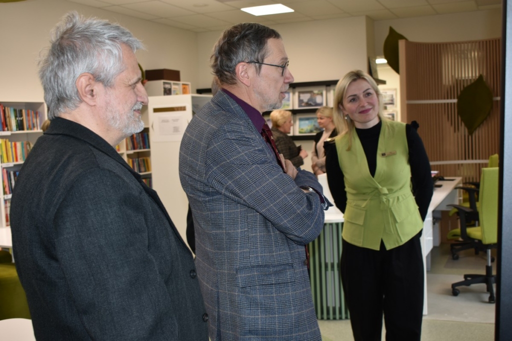 Prieš prasidedant parodos pristatymui, prof. L. Mažylis apžiūrėjo bibliotekos erdves bei šiuo metu bibliotekoje eksponuojamą išskirtinę Antano Dilio fotografijų parodą.