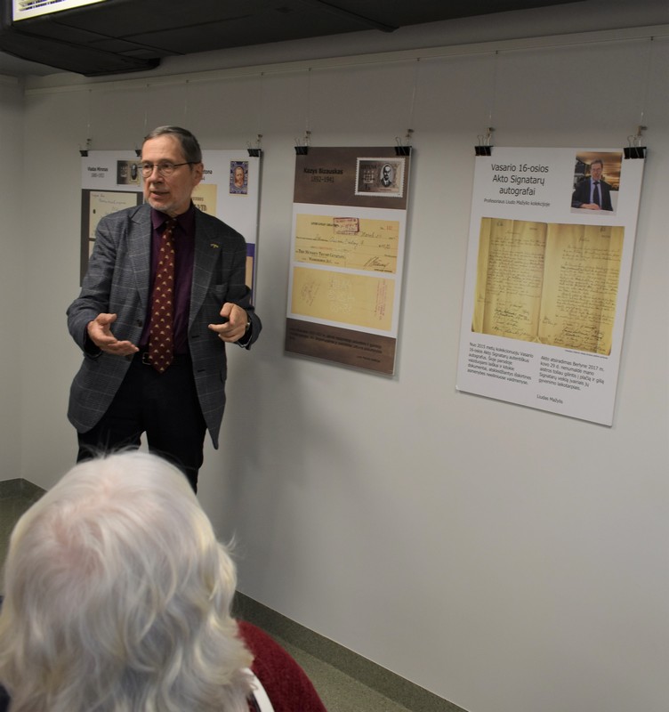 Profesorius Liudas Mažylis šiek tiek daugiau nei prieš šešerius metus, 2017-ųjų kovo 29-ąją atrado Vasario 16-osios Akto originalą lietuvių ir vokiečių kalbomis Berlyne. Net ir dirbdamas Europos Parlamente toliau daug dėmesio skiria istorinės atminties temoms. Bibliotekoje vykusiame parodos pristatyme – jo asmeninėje kolekcijoje svarbiausio Lietuvos dokumento Signatarų autografai. Apie tai, kokias Vasario 16-osios Signatarų asmenybių detales atkleidžia šie eksponatai ir ką per juos kartu galime suprasti apie mūsų modernios valstybės, visuomenės raidą , pristatė pats prof. Liudas Mažylis.