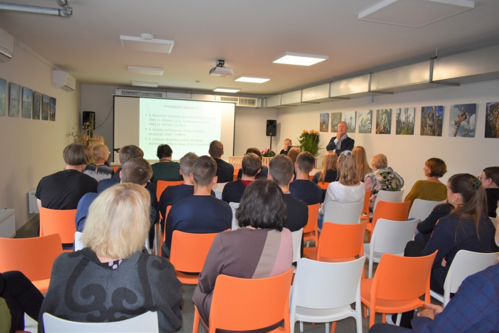 Po pietų vykusiame susitikime-pokalbyje „Baltijos kelias – Europos diena stalinizmo ir nacizmo aukoms atminti“ atsargos pulkininkas Arūnas Dudavičius skaitė istorinę paskaitą, kurios metu prisiminti įvykiai nuo 1939 m. rugpjūčio 23 d. iki šių dienų. Šią dieną buvo pasirašytas Molotovo-Ribentropo paktas, kuris turėjo įtakos Antrojo pasaulinio karo pradžiai ir Baltijos šalių nepriklausomybės panaikinimui. Paskaitos metu A. Dudavičius pasakojo apie Lietuvos sovietinę okupaciją, represijas, lietuvių trėmimus, tautos naikinimą. Atsargos pulkininkas papasakojo ir apie lietuvių kovą už laisvę – rezistencinį pasipriešinimą, sąjūdžio susikūrimą. Buvo prisimintas Baltijos kelias, kurio metu visos Baltijos šalys susivienijo prieš okupantus ir šią dieną stojo į gyvą žmonių grandinę, kovojančią už savo Tėvynę. Buvo pristatytos ir dvi knygos šia tema: Nijolės Gaškaitės ,,Pasipriešinimo istorija 1944–1953 metais“ ir Joanos Ulinauskaitės-Mureikienės „Likimo išbandymai“.