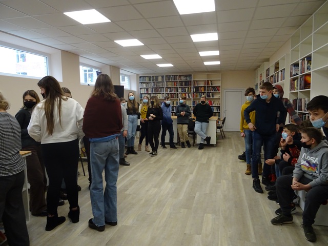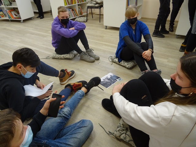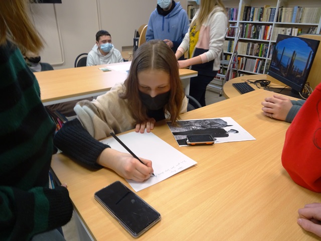 Žodžiai žodžiais, bet iškalbingiausia praktika, tad šešios grupės moksleivių gavo po užduotį – sukurti istoriją, kurios pagrindiniu veikėju taptų bibliotekoje esantis daiktas/personažas. Kiti istorijos kūrimo elementai buvo nurodyti grupei pateiktame žaidimo lape. Kiekvieno mokinio pasiūlymai su „kolegomis“ aptarti, į juos atsižvelgta – tuoj pat jungiant į rišlų tekstą. Sudėliojus ir apipavidalinus, jis pristatytas kitoms grupėms, grindžiant, rodant dėmesį atkreipusį ar bibliotekos lentynose aptiktą eksponatą. Atidžiai išklausyti ir apsisprendimą lėmę argumentai. Visiems smalsu buvo išgirsti, kuo tam tikras daiktas, personažas patraukė grupės narių dėmesį ir nusipelnė moksleivio kuriamos istorijos.