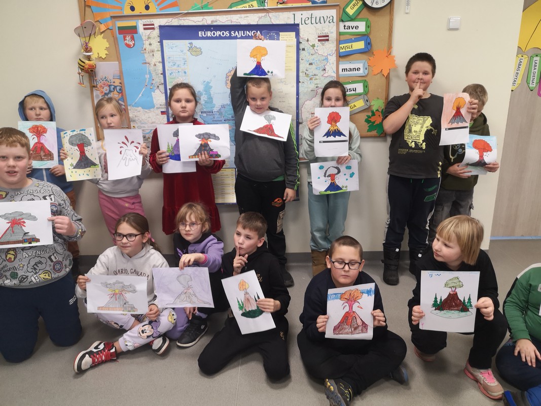 Po skaitymo per televizorių vaikams buvo parodytas įrašas apie ugnikalnio išsiveržimą, paskui vaikai gavo užduotį nuspalvinti ugnikalnius. Tai buvo puiki proga praplėsti savo žinias.