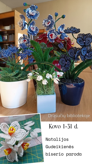 Drąsučių bibliotekos knygų fonde atidaryta visą kovo mėnesį veiksianti Šiaulių kurčiųjų meno užimtumo vadovės Natalijos Gudeikienės darbų paroda „Gėlės iš karoliukų“. Paveiksluose „sužydo“ biserio technika atliktos įvairiausios gėlės: narcizai, žibuoklės, snieguolės, orchidėjos, pakalnutės. Žiūrint ir grožintis kiekvienu darbu, nejučia prisimeni O. Černovos eilėraščio posmą: