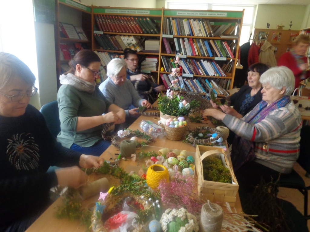 Balandžio 1-ąją Verbūnų biblioteka pakvietė skaitytojus į Šv. Velykų vainiko gaminimo edukaciją, kurią vedė tautodailininkė Liongina Šufinskienė. Edukatorė parodė vainiko karkaso darymo metodą, paaiškino, kaip skoningai naudoti puošybos elementus: gėlių žiedus, kiaušinius, medžių šakeles, dekoratyvines juosteles, plunksnas ir kt.