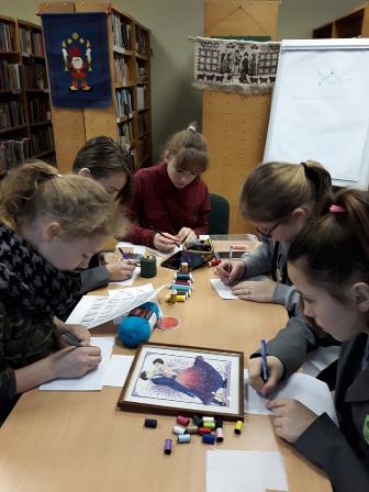 Pamokoje dalyvavo Gruzdžių gimnazijos septintos klasės mokiniai ir vyr. dailės mokytoja Vitalija Baranauskienė. Vyresniosios bibliotekininkės Jurgita Jasiškytė ir Liongina Šufinskienė papasakojo apie tai, kaip anksčiau lietuvės puošdavo savo drabužius, kokius raštus naudodavo, buvo paruoštos schemos, audinys, siūlai ir paaiškinta kaip ir nuo ko reikia pradėti. Susipažinimui su šia technika, buvo pasiūlyta moksleiviams išsisiuvinėti savo vardo pirmąją raidę. Visi stengėsi kuo tiksliau ir gražiau išsiuvinėti. Gal pradžioje ne visiems taip gerai sekėsi, tačiau visi buvo patenkinti pamoka.