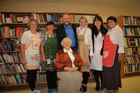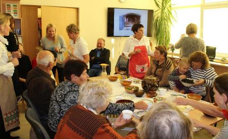 Į popietę atvyko ir aktyvi bibliotekos skaitytoja, Kuršėnų vyniotinio kūrėja Eugenija Dragūnienė. Visus sužavėjo šmaikštūs pasakojimai, pamokymai. E. Dragūnienė pasakojo: ,,Senais laikais reikėjo kažką sugalvoti iš tų pačių produktų: kiaušinių, miltų, sviesto. Pridėjus varškės gavosi vyniotinis, kurį kepiau daug metų“. Popietės dalyvė taip pat visus nustebino savo pagamintais traškučiais iš kopūsto lapų.