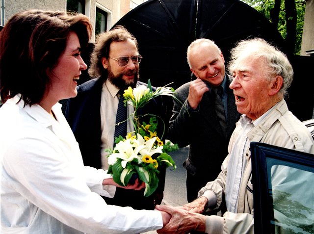 „Varpams“ – 10! Svečiuose – rašytojai. Nuotraukoje iš kairės – „Rūtos“ vyr. technologė Gitana Bandarienė, „Varpų“ vyr. redaktorius Leonas Peleckis, „Rūtos“ valdytojas Algirdas Gluodas, poetas Bernardas Brazdžionis. 1999-10-15