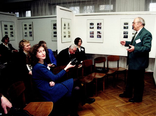 Fotografijos muziejuje (1-oji filokartijos) mokslinė konferencija. Kairėje – Regina Šulskytė, dešinėje – atvirukų kolekcijos autorius Henrikas Kebeikis. 2000-03-03