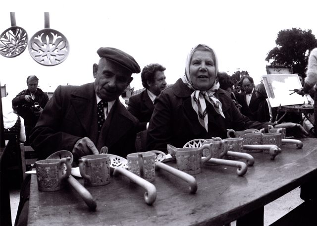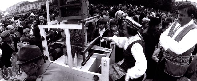 Mugė centriniame turguje. Tautinių juostų audėjai (kūrėjai) Birutė ir Antanas Dunduliai. 1983-09-18