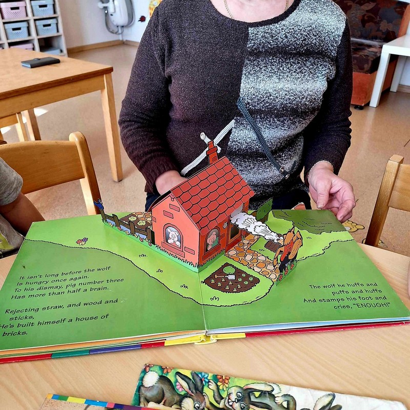 Balandžio 4 dieną, minint vaikų knygos dieną, bibliotekininkė, nešina gražiai iliustruotomis pasakų knygomis, apsilankė Drąsučių ikimokyklinio ugdymo grupėje „Boružiukai“. Mažieji įdėmiai apžiūrėjo spalvingas ir įdomias knygeles, vartė ir jomis džiaugėsi. Užsiėmimo metu vaikai smalsiai ir susikaupę klausėsi bibliotekininkės Janinos skaitomos pasakos su atvartais ir iškylančiom figūrom „Trys paršiukai“. Pasaka apie tai, kaip nedera tingėti, dirbti darbus atmestinai ir kad gera turėti ištikimą draugą, kuris gali pagelbėti ištikus nelaimei.