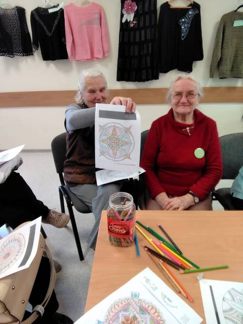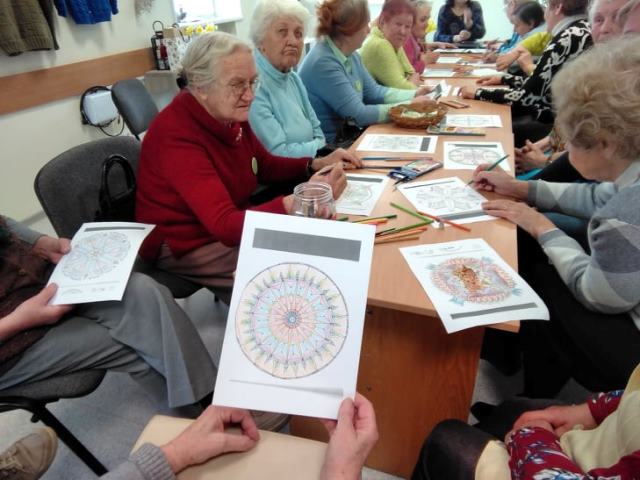 Dalyvės turėjo galimybę nusispalvinti pasirinktą mandalą. Popietėje dalyvavusioms senjoroms viešnia Jovita padalijo mandalų trafaretus ir dainuojant, menant mįsles, visos pasinėrė į kūrybą – spalvino susikaupusios ir įsijautusios. Bibliotekininkė Rimvida pristatė ir kiekvienai įteikė sukurtą klubo logotipą.