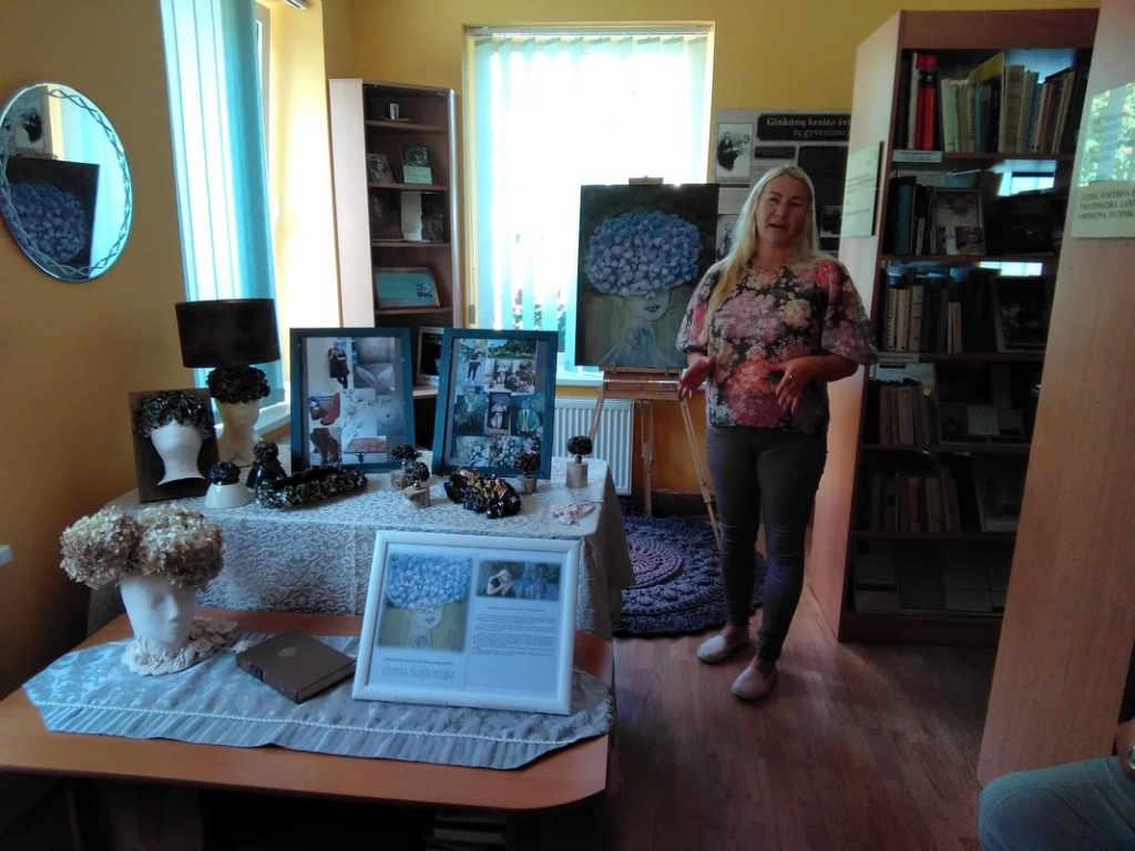 Rugpjūčio 18 d. Ginkūnų bibliotekoje vyko kūrybinių darbų parodos „Ponia Hortenzija“ pristatymas, jos autorė – šiaulietė menininkė Kristina Blantaitienė (Blanta Art). Parodoje eksponuojami tapyti paveikslai, keramikos dirbiniai (šviestuvas, vazos, vyno kamščiai, cukrinės, saldaininės), megztas kilimas ir kiti kūriniai. Paroda pavadinta „Ponia Hortenzija“ – labiausiai menininkei patinkančios gėlės, jos pavaizduotos paveiksluose, o keramikos gaminiuose hortenzijų žiedai įgauna erdvines formas ir džiugina savo spalvų spektru. Autorė savo kūrybine patirtimi pasidalino su popietės dalyviais. Ji kuria nuo vaikystės, tačiau prieš kelerius metus dekoruota namų siena su žirgu pastūmėjo judėti pirmyn kūrybos keliu, vėliau mokėsi tapyti bei keramikos subtilybių. Paveikslus Kristina tapo ant drobės akriliniais dažais. Keramikos darbai gimsta iš baltojo molio, pasitelkiamos įvairiaspalvės glazūros.