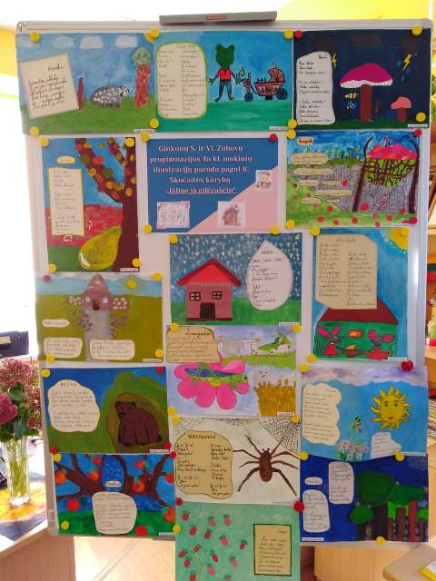Renginio metu visų akys krypo į bibliotekoje veikusią minėtos klasės mokinių parengtą  iliustracijų parodą pagal R. Skučaitės kūrybą „Išlipę iš eilėraščių“.