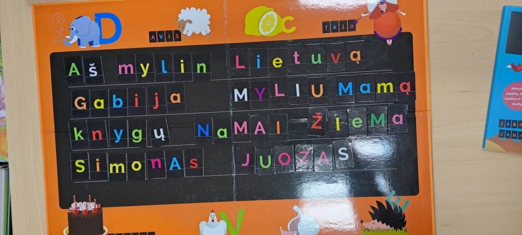 Kokie stebuklingi ženklai yra raidės! Jeigu jas pažįsti ir gali surikiuoti į žodžius ir sakinius, knygos tampa geriausiais tavo draugais! O knygose galima perskaityti tokių įdomių dalykų, kokių nė sapne nesusapnuosi! Tad bibliotekininkė paragino čiupti į rankas Abėcėlę ir leistis kartu su ja į linksmų raidžių spalvotą pasaulį: pristatė abėcėlinių knygelių parodą „Kas slepiasi abėcėlėje“, mokiniai gražino iliustruotas savo vardo raides, ant magnetinės lentos dėliojo raideles, kurios virto žodžiais, sakiniais. Taip norėtųsi, kad vaikai nuo mažens suprastų, kokia svarbi, graži, turtinga gimtoji kalba. Juk ne veltui Vydūnas yra pasakęs, kad kiekvienas, kuris kalba gimtąja kalba, yra mažasis menininkas.