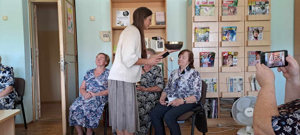 Laikas ,,Raiboje plunksnoje“ neprailgo ir tęsėme kelionę į Kairių biblioteką, kurioje vyko „Arbatos terapijos“ užsiėmimas – arbatos gėrimo ceremonija ir pažintis su meditacija. Biblioteka įgyvendina projektą „Emocinės stiprybės auginimas – sveikatos palaikymas bibliotekoje“, finansuojamą Šiaulių rajono savivaldybės. Užsiėmimą vedė lektorė iš VšĮ „Valandėlė sau“ Vilma Butkienė. Gurkšnojant arbatą pasitelkėme tik pozityvias mintis, džiaugėmės arbatos grožiu. Taip pat klausėmės skambančio Tibeto būgno ir Koshi varpelio garsų. Kelionė buvo nuotaikinga, pažintinė bei pilna atrakcijų.
