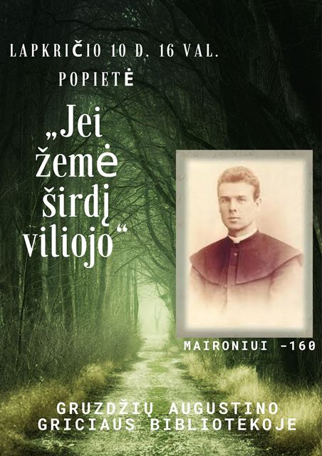 Lapkričio 10 d. Gruzdžių Augustino Griciaus bibliotekoje vyko popietė „Jei žemė širdį viliojo“, skirta poeto Maironio 160-osioms gimimo metinėms. Popietę pradėjome pakviesdami visus valandėlei užmiršti nenumaldomą norą kažkur bėgti, nebaigtus darbus, namų rūpesčius, pasinerti į poeziją, muziką ir… save.