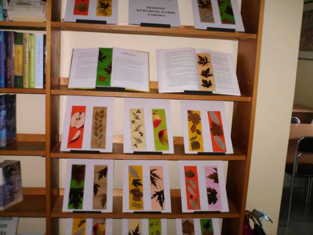 Kad nereikėtų pasižymėti skaitomą puslapį, užlenkiant jo kampą, buvo nuspręsta padaryti skirtukų. O juk įvairių priemonių, papuošti skirtukams, galima rasti gamtoje. Prisirinkę medžių lapų, sėklyčių ir kt. medžiagų iš gamtos mokiniai sukūrė skirtukus, kurie papuošė biblioteką. Norėdami skirtukus sutvirtinti ir džiaugtis jais ilgesnį laiką, juos specialiomis priemonėmis laminavome.