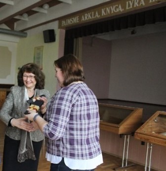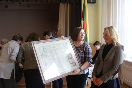 Svečiai Kuršėnų Vytauto Vitkausko bibliotekos vedėjai Jonetai Filinskei įteikė unikalią dovaną – įrėmintą seniausią Lietuvos žemėlapį.