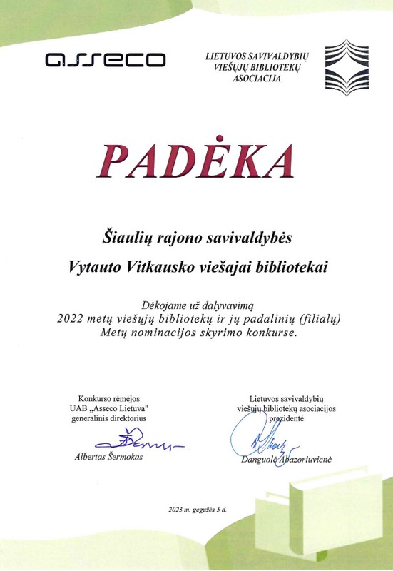 Tuo tarpu Šiaulių rajono savivaldybės Vytauto Vitkausko viešajai bibliotekai įteikta padėka už dalyvavimą 2022 metų viešųjų bibliotekų Inovacijų bibliotekos kategorijoje, už originalią ir inovatyvią veiklą diegiant netradicines paslaugas, neformalaus švietimo, edukacinių ir nuotolinių veiklų įvairovę. Padėką atsiėmė bibliotekos direktorė Ingrida Klupšaitė.