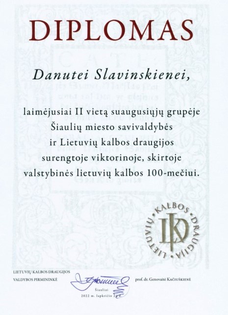 „Viktorinoje dalyvavau pirmą kartą. Buvo įdomu sužinoti, kokie klausimai. O šie – tikrai ne iš lengvųjų! Pavyzdžiui, ar žinote, kurioje Šiaulių mokykloje ilgiausiai veikia Lietuvių kalbos draugijos grupė, arba kurioje eilutėje surašyti zoonimai“, – įspūdžiais dalijosi bibliotekininkė D. Slavinskienė. Ji dalyvavo nesitikėdama laimėti ir paragino visus dalyvauti įvairiose viktorinose, nes, sako, bet kokiu atveju sužinosite kažką naujo.