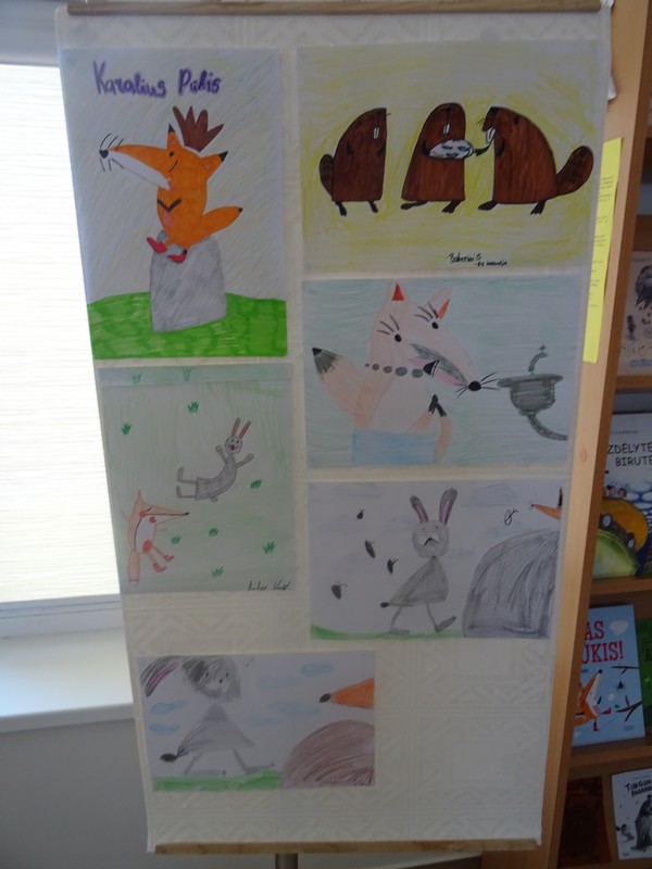 Prasidėjus kūrybinėms dirbtuvėms, mokiniai patys apžiūrėjo, pavartė parodoje eksponuojamas autoriaus knygas. Iš visų knygų labiausiai susidomėjo Pūkio istorija, todėl valančiukė Brigita Survilaitė, pagelbėdama mažiesiems, garsiai perskaitė knygos „Oi, tas Pūkis!“ kūrinius. Vėliau buvo aptarti, atpasakoti, išanalizuoti pagrindiniai veikėjai, jų paveikslai ir nuotykiai bei pagrindiniai charakterio bruožai.