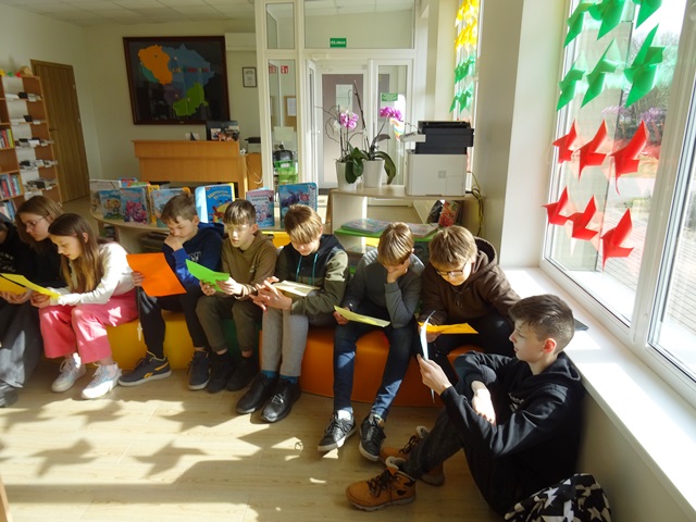 Po to pereita prie praktikos! Daugelis mokinių kruopščiai ieškojo savo norimos knygos Naisių bibliotekos fonduose (sąrašai buvo padėti ant stalo, kad mokiniai žinotų knygos pavadinimą ir autorių). Kai kurie tiesiog apžiūrinėjo grožinę ir šakinę literatūrą, kuri priklauso B, C, D grupių skaitytojams. Kaip buvo smagu ir netikėta, kad net du penktokai, Laurynas Paltarokas ir Matas Dura, išsirinkę knygas, pasiskolino perskaityti, sakydami, kad jau seniai jų ieškojo, tik negalėjo niekur surasti!