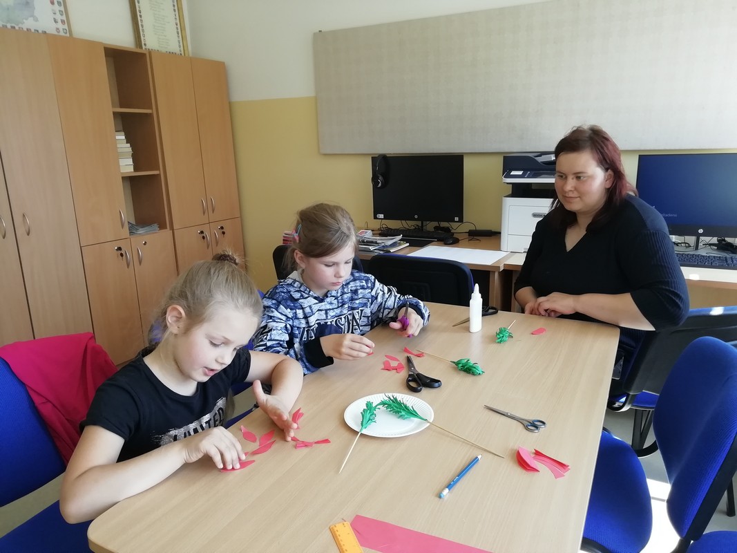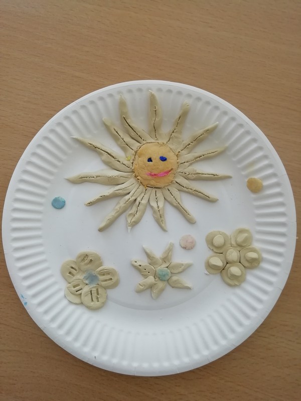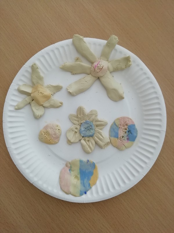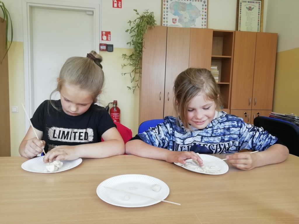 Šiltas, saulėtas savaitgalis viliojo keliauti ar pabūti prie ežero, todėl atsirado nedaug norinčių kurti dirbtinius žiedus. Nors aplink gausybė įvairiaspalvių, kvepiančių žiedų, edukacinio užsiėmimo metu žiedai „pražydo“ iš modelino ir popieriaus. Į gamybos procesą įsitraukė ir vienos iš mergaičių mamytė. Viskas sekėsi puikiai. Mergaites labiau domino žiedų kūrimas naudojant modeliną. Buvo bandoma išgauti įvairias formas ir dydžius. Darant žiedus krepinio popieriaus, atraižėlės panaudotos modelino dažymui. Taip pagamintas spalvotą modelinas darbeliams suteikė savitumo.