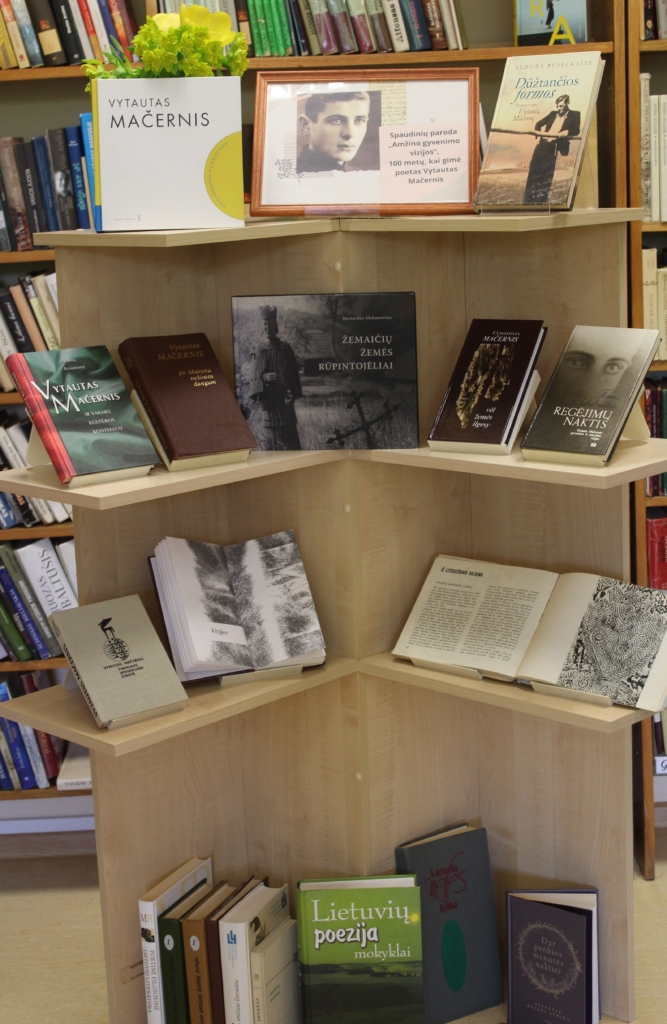 Spaudinių parodoje, kurią mielai lanko bibliotekos skaitytojai, eksponuojama V. Mačernio kūryba, kritikos straipsniai, populiarus A. Ruseckaitės romanas „Dūžtančios formos“, viena naujausių knygų „Man patiko tik vandenys gilūs“. Joje pirmą kartą spausdinami du eilėraščiai, kuriuos poeto sužadėtinė Bronė Vildžiūnaitė perdavė Maironio lietuvių literatūros muziejui. Tai – „Po milijono metų, gal daugiau…“ ir „Kai ašen kartą po ilgų kelionės metų…“ Prie knygos yra ir kompaktinė plokštelė.