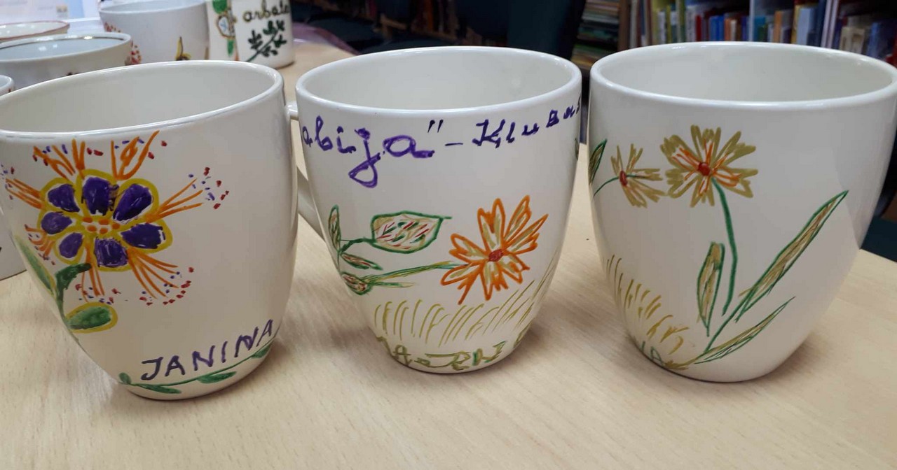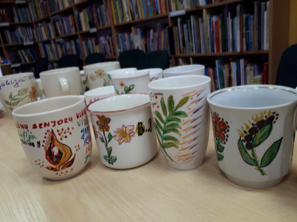 Biblioteka aprūpino susirinkusiuosius reikalingomis priemonėmis: keramikai skirtais dažais, teptukais. Puodelių dekoravimo procesas suteikė daug gražių ir džiaugsmingų akimirkų. Namo parsinešę pačių dekoruotą puoduką, gurkšnojant kavą ar arbatą galėsime mėgautis savo originaliais kūriniais.