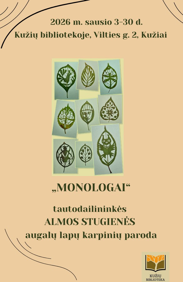 2–30 d. – ŠIAULIŲ RAJONO SAVIVALDYBĖS VYTAUTO VITKAUSKO VIEŠOJOJE BIBLIOTEKOJE – Žiniasklaidos skaitykloje – Stasės Vilkienės karpytų portretų paroda „Grąžinu skolą ir meldžiuosi“