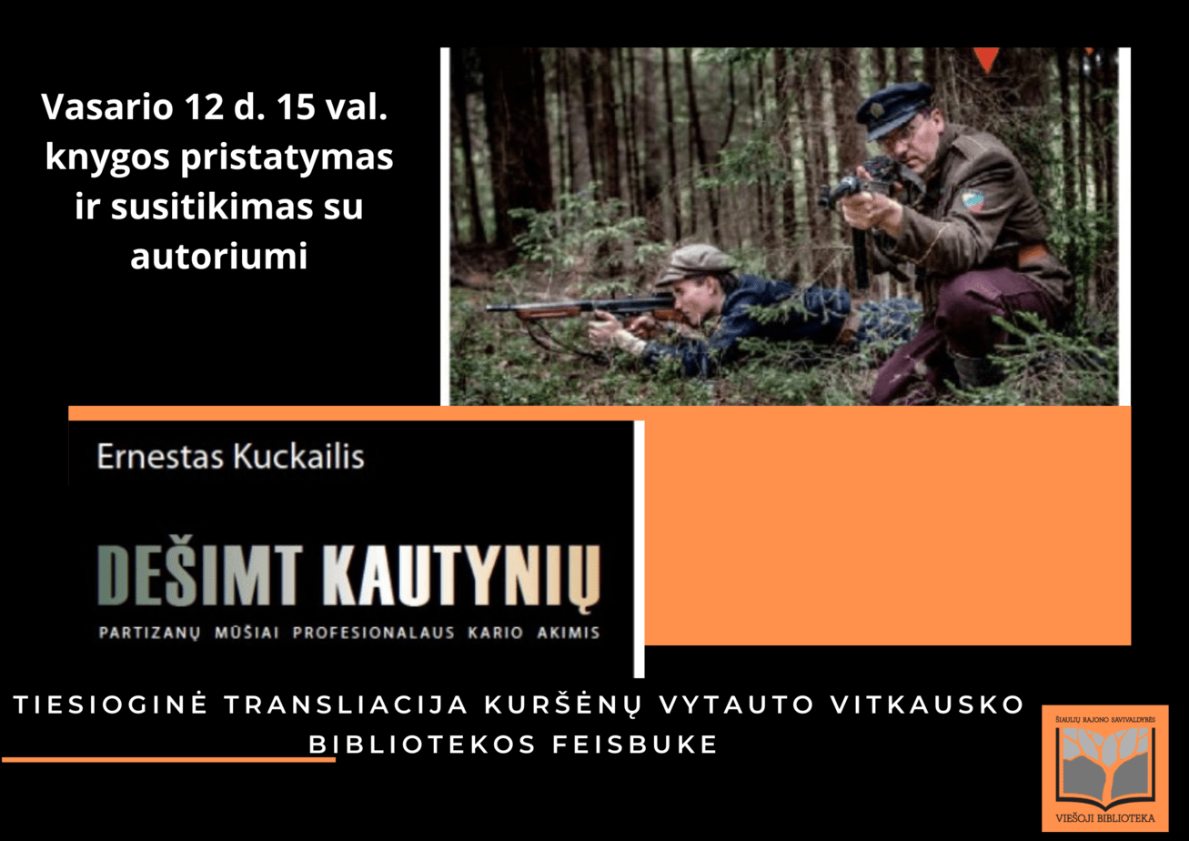 Kuršėnų Vytauto Vitkausko bibliotekos feisbuke bus transliuojamas virtualus susitikimas su Lietuvos kariuomenės viršila Ernestu Kuckailiu. Svečias pristatys savo naujausią knygą „Dešimt kautynių“. Autorius, pats būdamas karys, profesionalo žvilgsniu, ginkluotės, karybos ir taktikos požiūriu įvertino ir aprašė dešimtį partizanų kautynių su priešu.