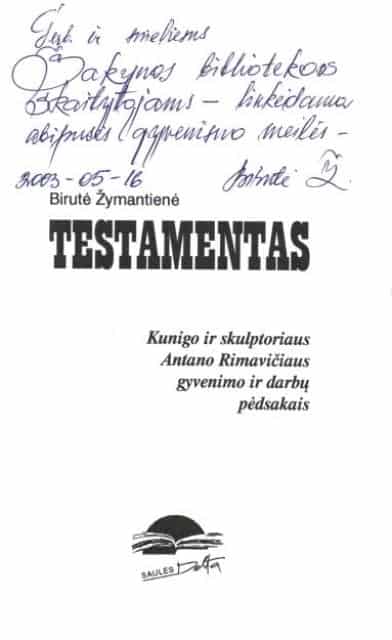 Testamentas : kunigo ir skulptoriaus Antano Rimavičiaus gyvenimo ir darbų pėdsakais / Birutė Žymantienė. – Šiauliai : Saulės Delta, 1998. – 103, [2] p., įsk. virš. : iliustr., faks..
