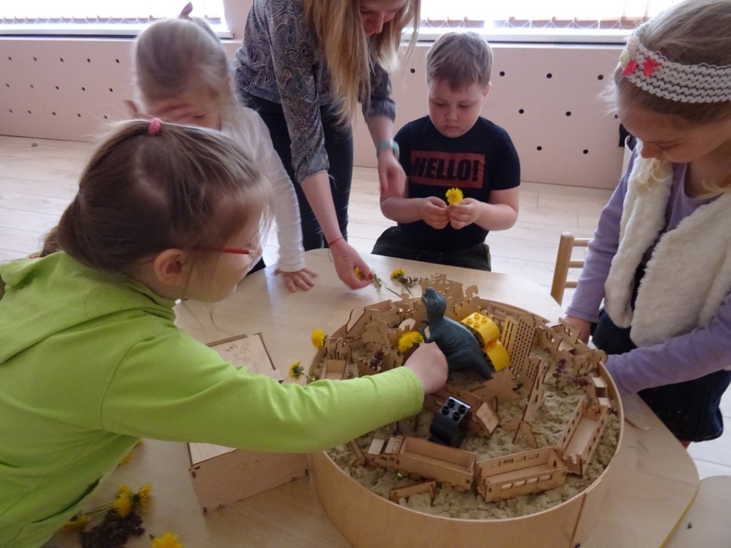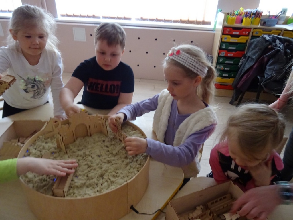 Užsiėmimo pradžioje visi mažieji auklėtiniai kartu su savo mokytoja Gražina Meiliūniene iš šalia esančios pievos pririnko įvairių gėlių, o tada, visiems suėjus į darželio patalpas, užvirė darbas. Bibliotekininkė D. Remeikienė skaitė knygelę ,,Peppa Pig. Žaidimai smėlio dėžėje“, o bibliotekininkė V. Jaškauskienė pasiūlė vaikams pasidalinti į dvi grupes ir pagal skaitomą pasaką kurti savo miestus. Išradingumo ir emocijų netrūko, kartais reikėjo tik nuoširdaus patarimo ir elementarios pagalbos. Mažieji statybininkai kinetinio smėlio dėžėje statė namus, parduotuves, tiesė tiltus, sodino medžius ir gėles, kasė šulinius, o pačioje slapčiausioje vietoje apgyvendino net dinozaurą! Vėliau savo miesto gražiausiose vietose statė vėliavėles, kurias įvairiomis geometrinėmis figūromis, savo veidukais patys puošė, piešė, spalvino, dekoravo.