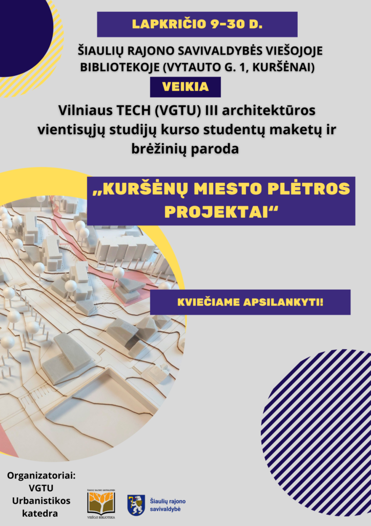 Bibliotekos renginių salėje nuo lapkričio 9 d. iki lapkričio 30 d. veikia Vilniaus TECH III architektūros vientisųjų studijų kurso studentų maketų ir brėžinių paroda „Kuršėnų miesto plėtros projektai“.