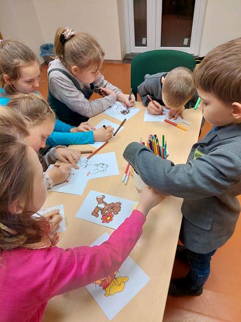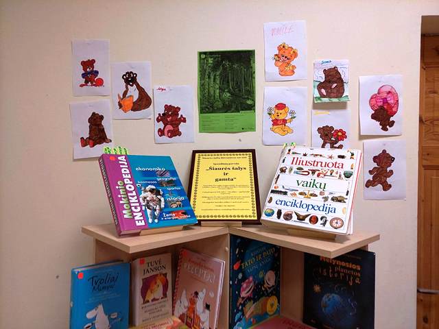 Susipažinę su Šiaurės šalių rašytojų kūrinių paroda „Šiaurės šalys ir gamta“, vaikai piešė meškiukus, pasakojo istorijas apie sutiktus miške žvėrelius.