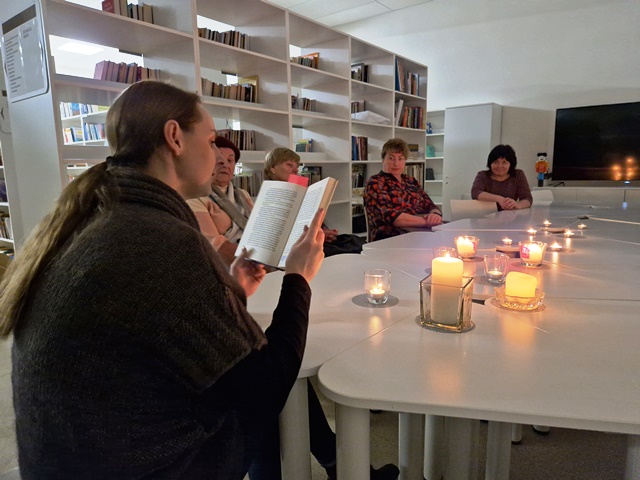 Vakarėjant į bibliotekos suaugusiųjų abonementą susirinko Trečiojo amžiaus universiteto studentės, kurios dalyvavo suaugusiesiems skirtuose garsiniuose skaitymuose „Sutemų valanda“. Žvakių šviesoje klausytasi švedų autoriaus Patrik Svensson knygos „Apie ungurius ir žmones: mįslingiausios pasaulio žuvies istorija“ ištraukų „Prie upės“ bei „Pažiūrėti unguriui į akis“. Po skaitymo senjoros dalijosi įspūdžiais apie knygoje aprašytą šiaurinę gamtą, žvejybos ir žuvies gaminimo ypatumus, vyko diskusija apie sūnaus ir tėvo ryšį, žmogaus kelią pasaulyje.