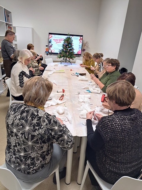 Tą pačią dieną Edukacijų erdvėje rinkosi bibliotekos rankdarbių būrelio „Svajingosios levandos“ narės. Vyresnioji bibliotekininkė Asta Urbelienė organizavo edukacinį užsiėmimą „Vatinukai – senoviniai Kalėdų eglutės žaisliukai“. Prieš kūrybinį procesą lektorė trumpai supažindino su senovinio žaisliuko istorija, papasakojo, kad anuomet gaminti varvekliai, grybukai, meškiukai. Pagrindinės priemonės, reikalingos šiai nuostabiai dekoracijai, yra vata, iš krakmolo ir vandens pagaminta masė, folija formai padaryti, varinė vielutė žaisliukui pakabinti. Dalyvės išėjo pakilios ir šventinės nuotaikos, prieš tai sutarusios kitoje edukacijoje pasigaminti dar įmantresnį žaisliuką.