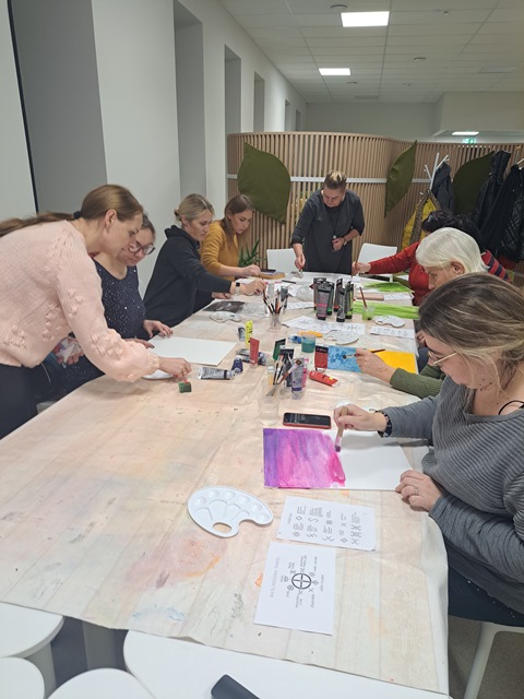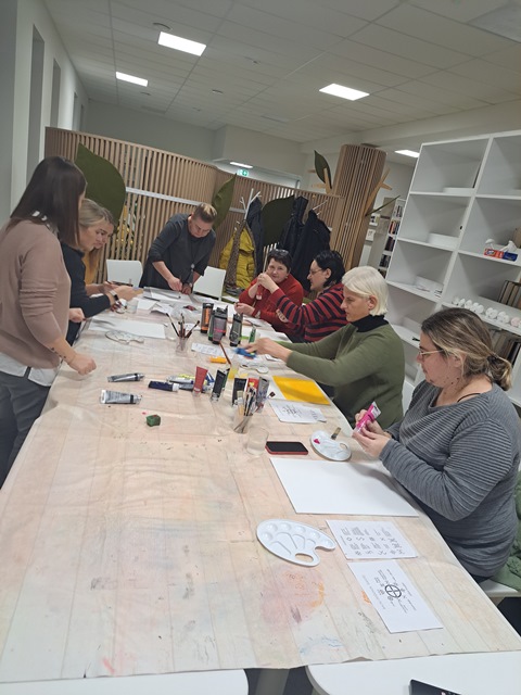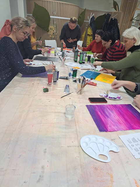 O lapkričio 24-osios pavakarę bibliotekos skaitytojų klubo „(Ne)keista skaityti“ nariai rinkosi ne tik aptarti perskaitytų knygų, bet ir į edukacinį užsiėmimą „Biblioterapija ir šviečiančių paveikslų tapymas“. Šįkart su vyriausiąja bibliotekininke Vilma Grudžinskiene klubo nariai aptarė net du grožinius romanus – Lucinda Riley „Orchidėjų namai“ ir Golnaz Hashemzadeh Bonde „Tai buvome mes“. Abi knygos labai skirtingos – dailus, gražus, ramus grožinis romanas bei jautri, liūdna ir skausminga istorija. Tapymas ant drobės nuteikė raminamai, atskleidė susirinkusiųjų kūrybiškumą, išlaisvino vaizduotę. Šio tapymo principas tas, kad ant akriliniais dažais padengtos drobės tapoma fluorescenciniais dažais, kurie atspindi šviesą tamsoje pasitelkiant UV lempą. Tapybos dirbtuvės organizuotos vykdant projektą „Baltų ženklai tvyro ore“, kuris iš dalies finansuojamas Lietuvos kultūros tarybos, partnerė – Šiaulių rajono savivaldybė.