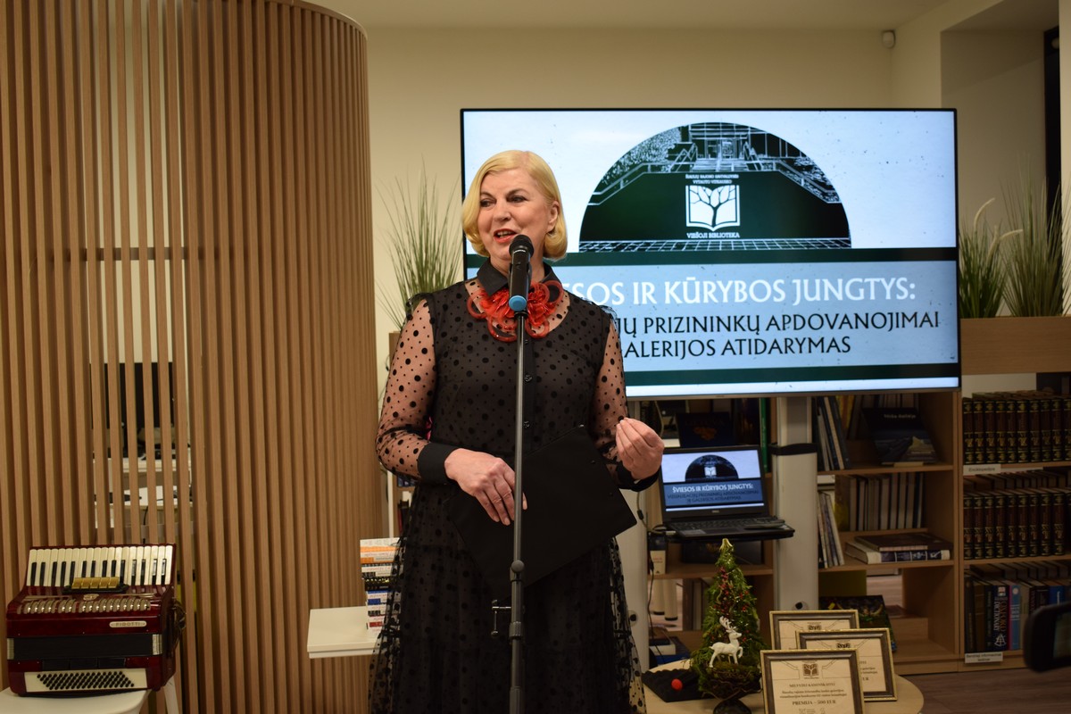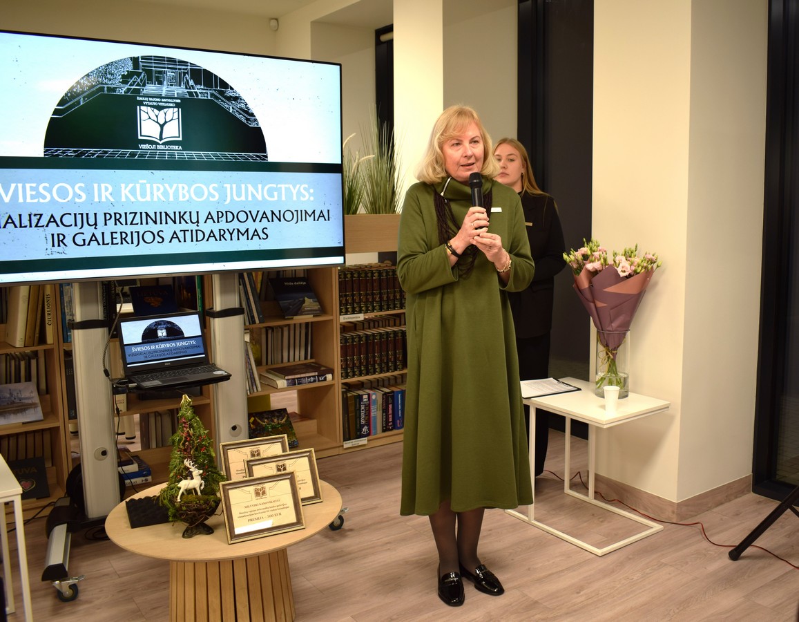 Po apdovanojimų ir meninės Nijolės Narmontaitės programos svečiai pakviesti į bibliotekos antrą aukštą, kur atidaryta grafikės Elvyros Kairiūkštytės galerija. Šis atidarymas – Lietuvos kultūros tarybos finansuojamo projekto „360° galerija Elvė sugrįžta namo“ baigiamoji dalis, kuria siekiama įamžinti išskirtinės kūrėjos atminimą. Bibliotekos Informacijos ir vadybos skyriaus vedėja Joneta Filinskė priminė, kad 2024 m., menininkės palikimo paveldėtojams padovanojus apie du šimtus grafikos darbų ir publikacijų, biblioteka tapo šios išskirtinės kūrėjos paveldo saugotoja. Didelė dalis menininkės darbų yra itin didelio formato, susukti rulonuose, daug metų nebuvo eksponuoti, taigi pagrindine projekto ašimi tapo inovatyvi 360° virtualios realybės galerija, matoma per virtualios realybės akinius. Penkiasdešimties linoraižinių ir piešinių suskaitmeninimas leidžia lankytojui ne tik stebėti itin aukštos raiškos kūrinius, bet ir įžengti į menininkės metafizinių erdvių pasaulį, vaikščioti po temines ekspozicijas, išgirsti pasakojimų apie jos kūrybos kelią ir išskirtinį kūrybos braižą. Pirmą kartą Elvyros Kairiūkštytės palikimas pristatomas virtualiai ir interaktyviai, paverčiant jį prieinamą ir tiems, kurie negali fiziškai apsilankyti parodose. Virtuali paroda jau eksponuota šešiose Lietuvos viešosiose bibliotekose, o 2025 m. spalio mėnesį, minint E. Kairiūkštytės 75-ąsias gimimo metines, grafikės fizinių darbų paroda surengta Šiaulių dailės galerijoje. Ten pat pristatytas bibliotekininkų parengtas autorės kūrinių katalogas, suteikiantis galimybę išsamiau pažinti kūrėjos palikimą.