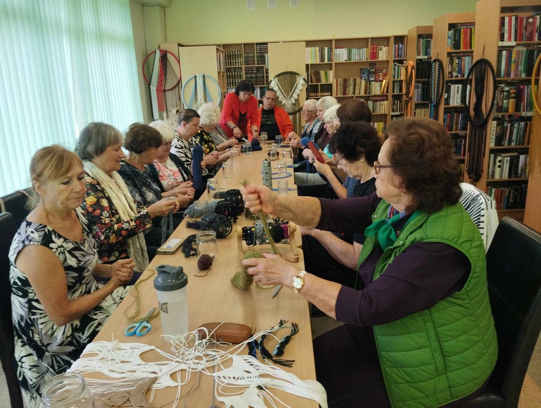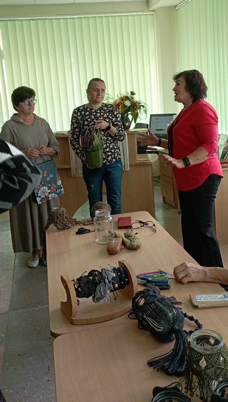 Rugsėjo 25 d. pasikvietėme Almą Meškienę į susitikimą su Šiaulių rajono neįgaliųjų draugijos Gruzdžių padalinio narėmis ir Šiaulių rajono Trečiojo amžiaus universiteto Gruzdžių filialo studentėmis. Meistrė trumpai supažindino su makrame technika, papasakojo apie 2023 metais Šaukėnų seniūnijoje šios technikos pagalba papuoštą kalėdinę eglę, pristatė savo veiklas. Vėliau tautodailininkė renginio dalyvius mokino pasigaminti žibintą iš stiklainio, apipinant jį siūlais makrame technika.