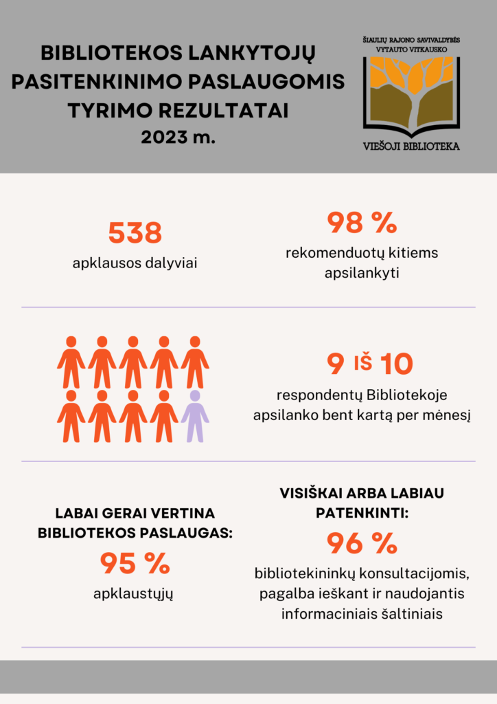 Šių metų gegužės 31 d. – liepos 31 d. Šiaulių rajono savivaldybės Vytauto Vitkausko viešoji biblioteka (ŠRSVB) vykdė lankytojų apklausą, siekdama įvertinti gyventojų pasitenkinimą teikiamomis paslaugomis.