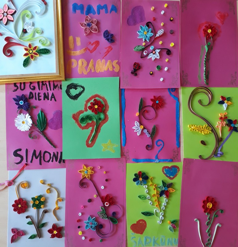 Sekančią dieną Kurtuvėnų bibliotekoje svečiavosi Aukštelkės kaimo bendruomenės „Aukštarūžė“ pirmininkė Violeta Budreckienė ir bendruomenės narė Dalia Damirova. Moterys vaikus supažindino su kvilingu, parodė šia technika atliktų darbelių ir pasiūlė patiems pasigaminti po darbelį-sveikinimą. Darbeliai gavosi puikūs ir kiekvienas gaminęs žinojo, kam tą sveikinimą skirs.