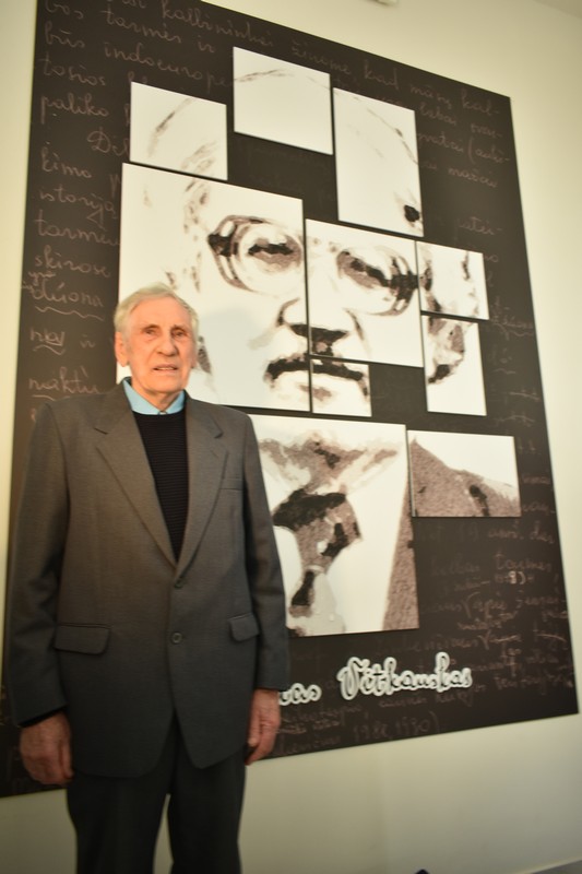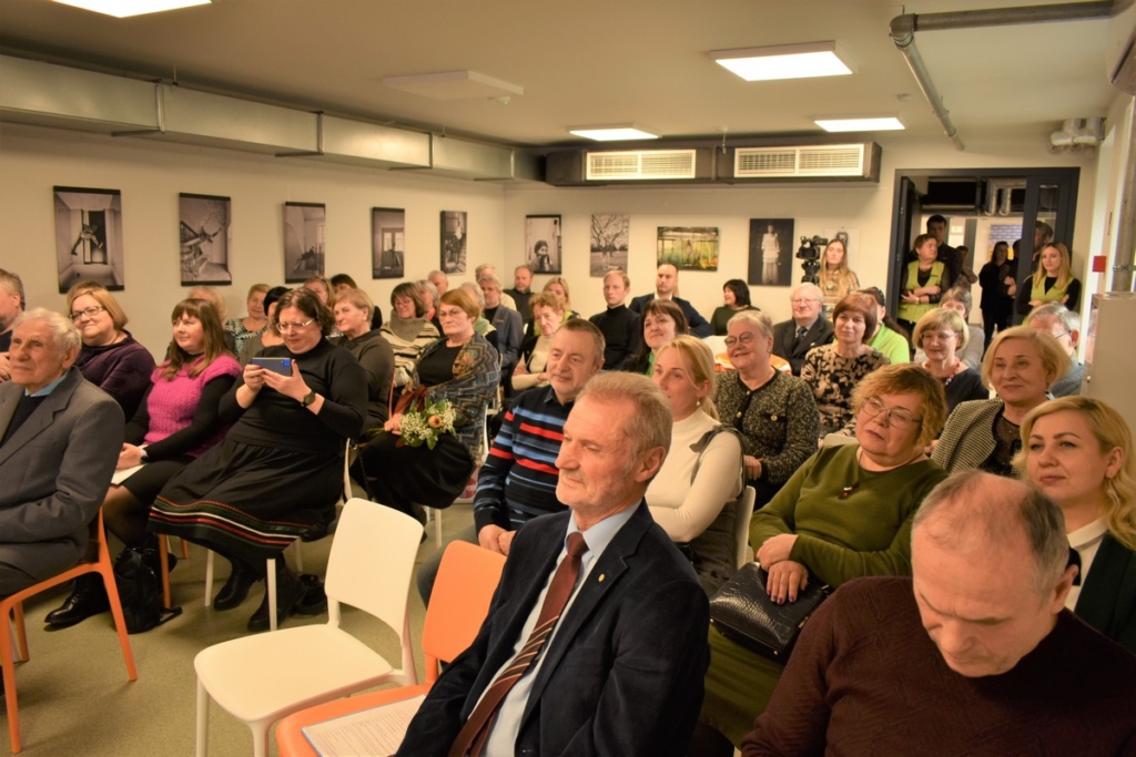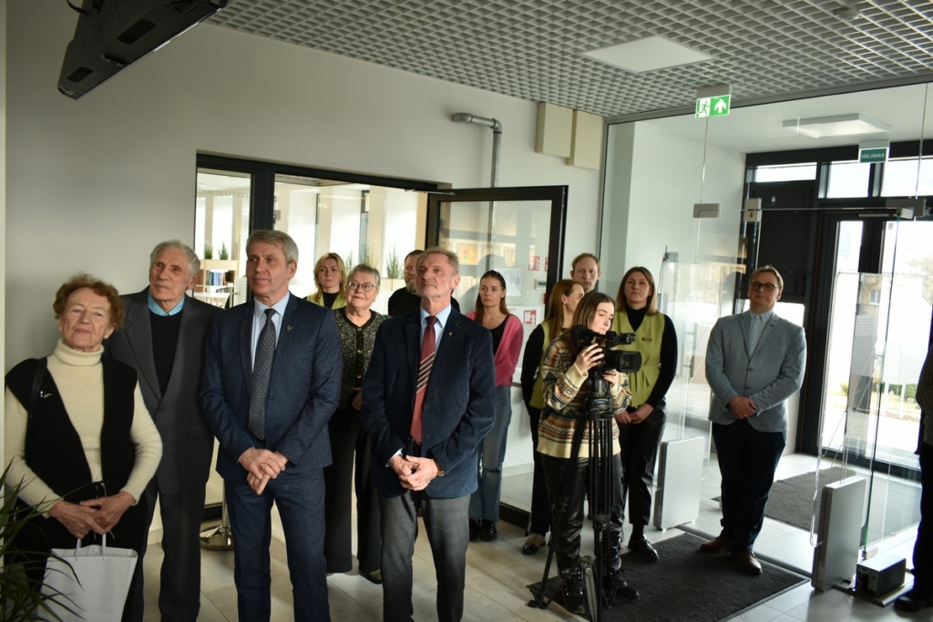 Susirinkusieji svečiai būriavosi laiptinėje ir vestibiulyje, kuriame eksponuojama stendinė paroda „Kuršėniškio kalbininko, profesoriaus Vytauto Antano Vitkausko gyvenimo ir veiklos momentai“. O kodėl laiptinėje? Nes būtent laiptinę papuošė vaikiškų knygelių autoriaus ir iliustratoriaus Dainiaus Šukio paveikslas Vytautui Vitkauskui. Renginio vedėjas aktorius Giedrius Arbačiauskas sveikinimo žodį tarti pakvietė bibliotekos direktorę Ingridą Klupšaitę, kuri, drauge su V. Vitkausko broliu Algiu Vitkausku, atidengė minėtąjį paveikslą.